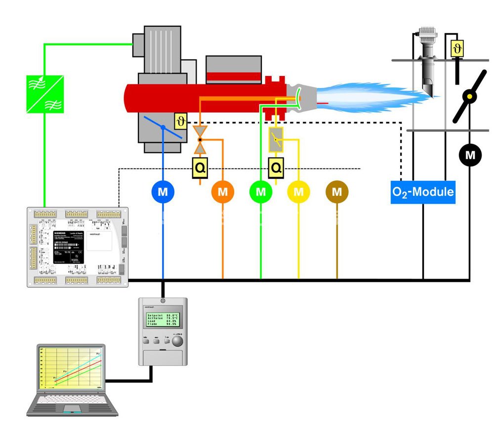 智能控制系统:电子比调控制风门、燃气执行器、风机频率、烟气在循环执行器、氧量传感器、氧量修正燃烧空燃比例等。